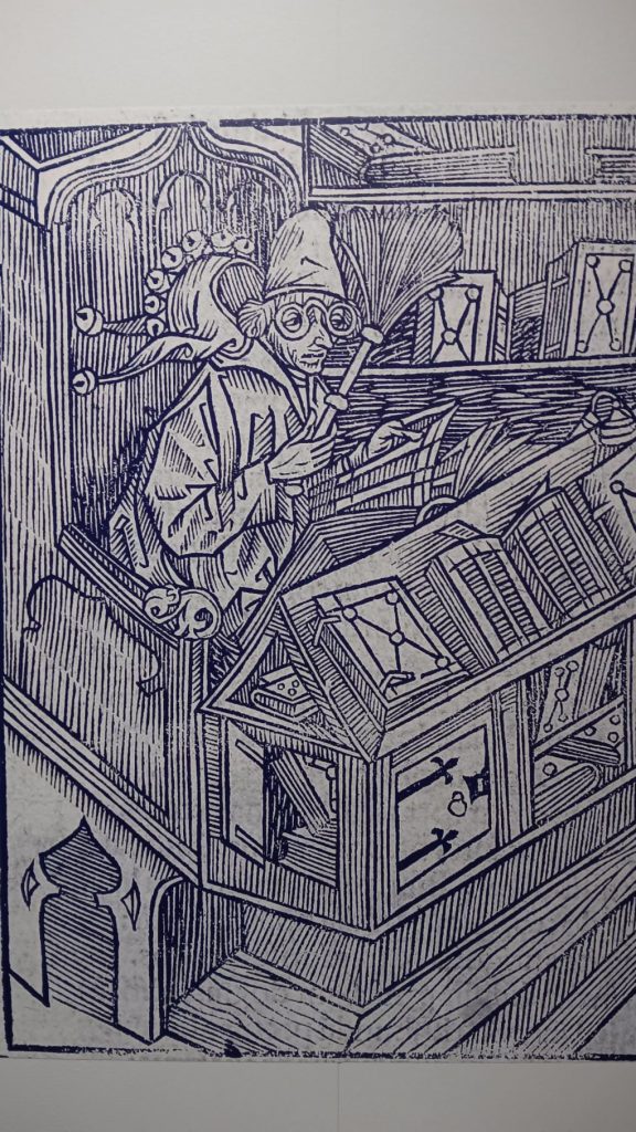 Cette image est extraite de La Nef des fous, best-seller de la Renaissance, publié initialement en 1494, écrit par Sébastien Brant et illustré par divers artistes, dont Dürer.