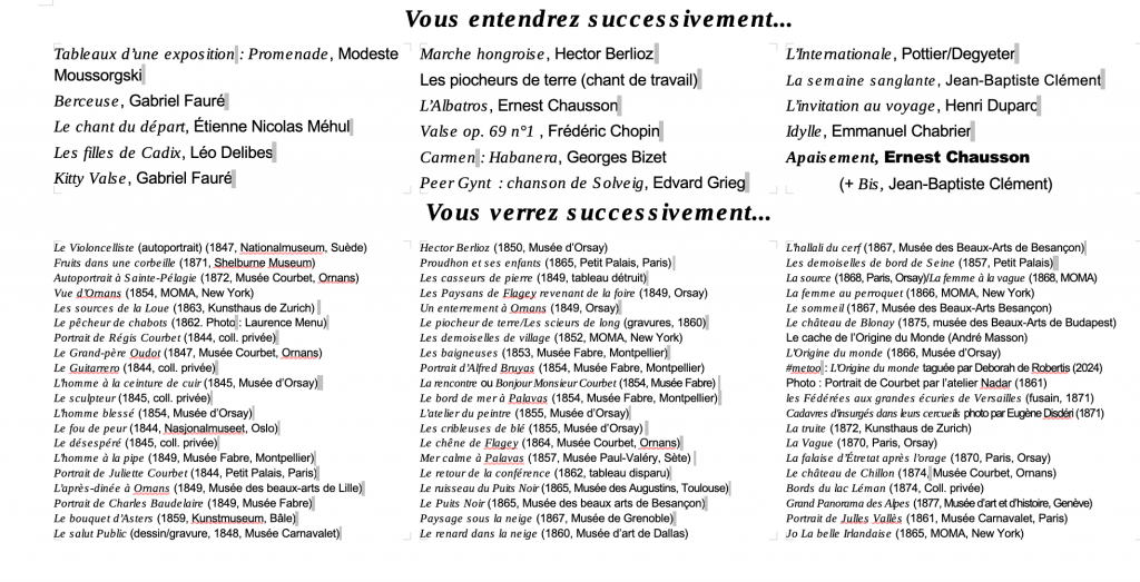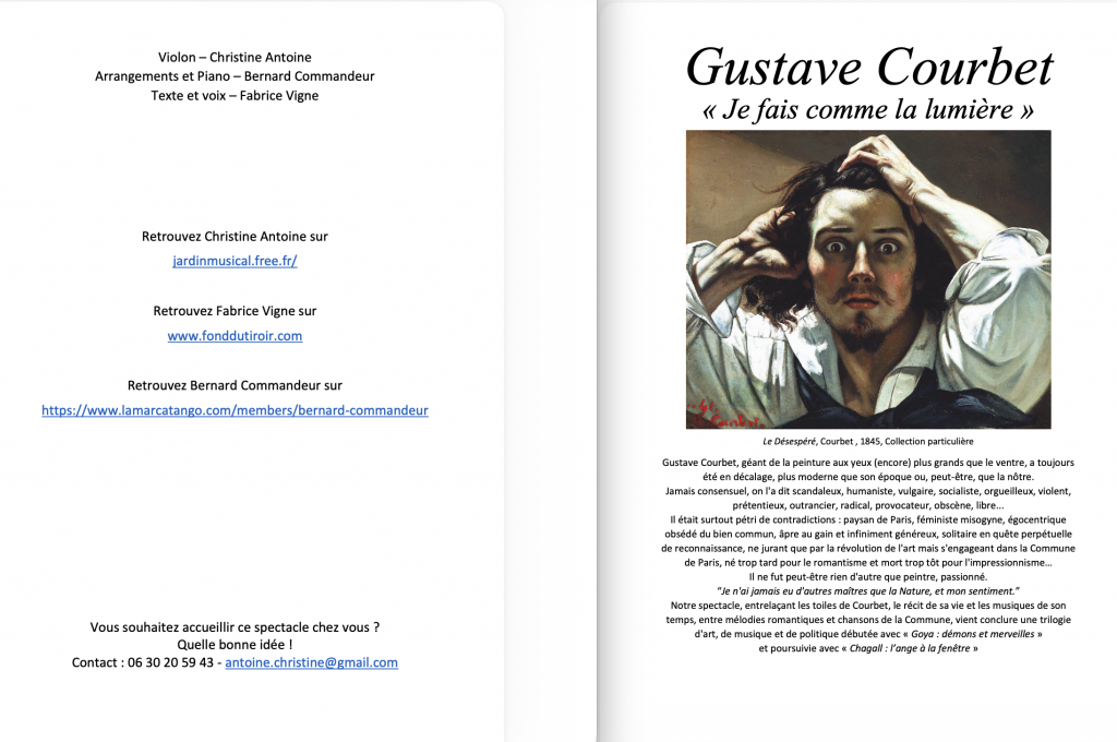 Notre spectacle, entrelaçant les toiles de Courbet, le récit de sa vie et les musiques de son temps, entre mélodies romantiques et chansons de la Commune, vient conclure une trilogie d’art, de musique et de politique débutée avec « Goya : démons et merveilles“ et poursuivie avec ”Chagall : l’ange à la fenêtre ».