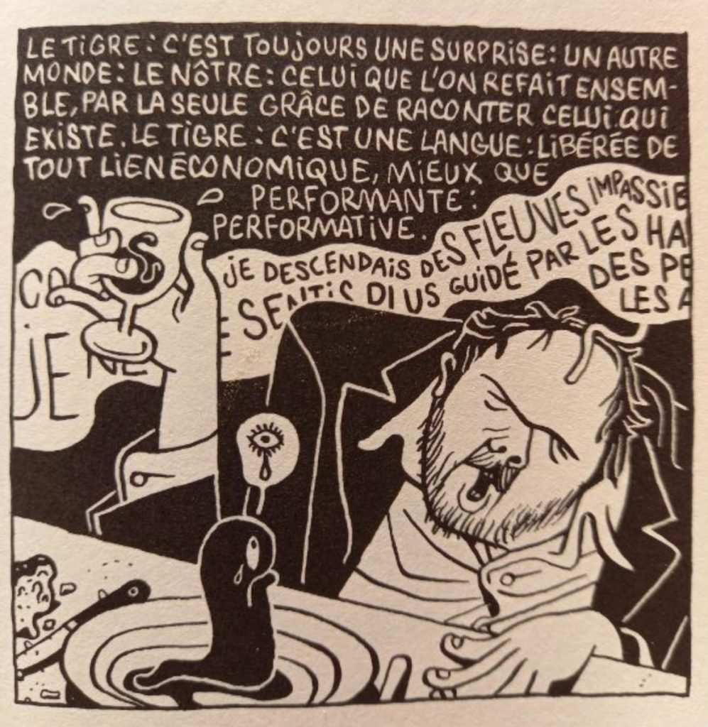 En revanche ! Je publie ci-dessous une case de ce même livre qui est une autre surprise : un autoportrait de Patrice Killoffer aviné déclamant en fin de banquet « Comme je descendais des fleuves impassibles… » Voilà qui me donne l’occasion d’un nouveau post-scriptum au sujet de ma propre obsession pour Le Bateau ivre de Rimbaud.